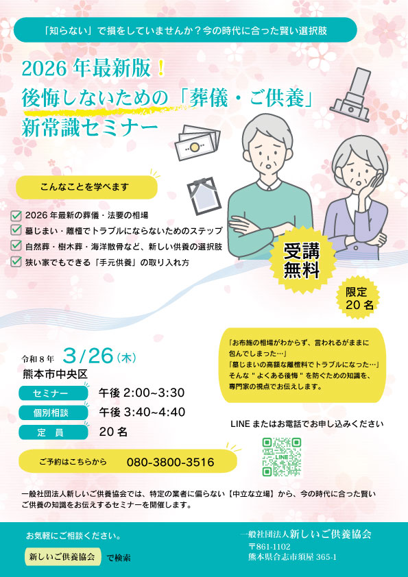 一般社団法人新しいご供養協会では、特定の業者に偏らない【中立な立場】から、今の時代に合った賢いご供養の知識をお伝えするセミナーを開催します。